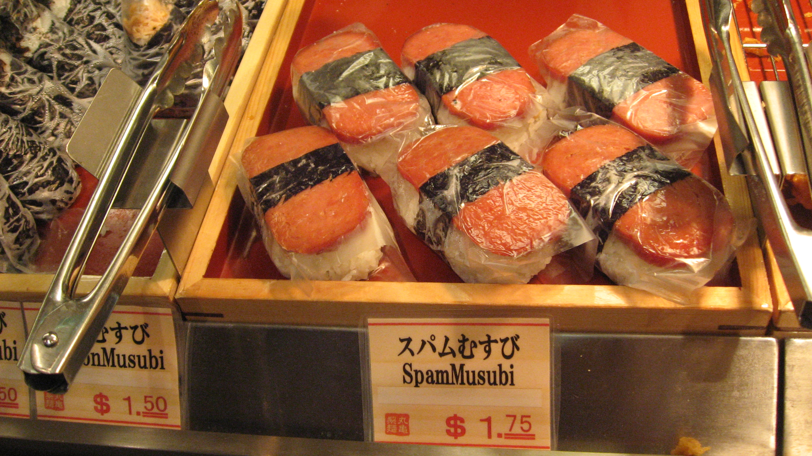 Oahu, of course, is more than a crossroads for textbook history. Waikiki’s transient tourist community has an especially prominent Japanese presence. The grocery store carries bento-box lunches and other Japanese style to-go food with multi-language labels, but offers only plastic forks, not chopsticks at the check-out. There’s an Aloha sushi chain, ubiquitous bilingual reminders that tips are not included in restaurant bills and taxi fares, and local guys cat-calling after pretty girls in awkward Japanese, “kawaii desu ne!” (pretty, isn’t it?). The commodified, superficial mix of cultures (as food/shopping/kitsch), is perhaps most obviously materialized as ‘spam musubi’ – Hawaiin pork, American processed into Japanese convenience food: