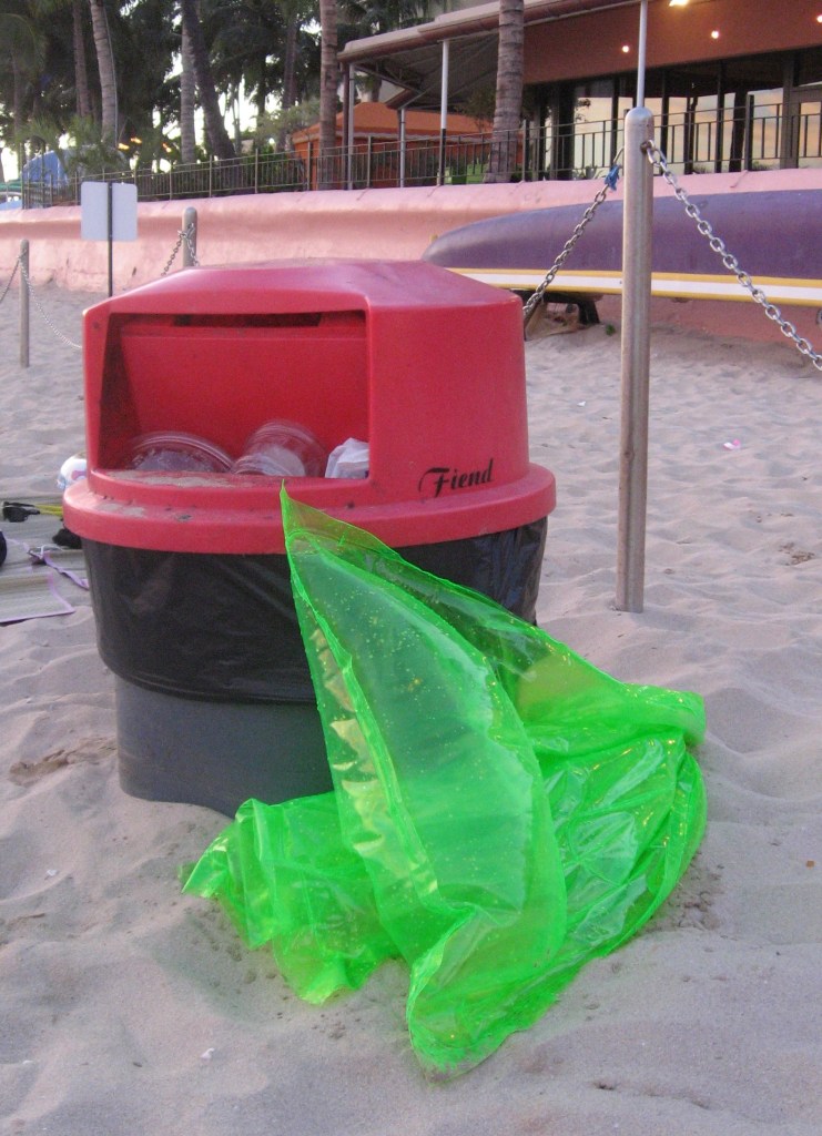A few days ago, I had a long phone conversation with a founding member of B.E.A.C.H. who pointed me in the right direction for beach clean-up, strongly recommending gloves as protection against the dangerous synthetic chemicals like DDT that adhere to the surface of ocean plastics at many, many times the concentration of surrounding water. She was also adamant that BEACH was not simply a beach cleanup organization. In fact, she had refused to participate in a cleanup of Waikiki beach on grounds of lacking litter prevention measures. In response to my commenting that tourists act as if maid service extends to the beach, she replied with a story of a man finishing a cigarette and dropping it deliberately on the ground in the path of a girl scout collecting litter.