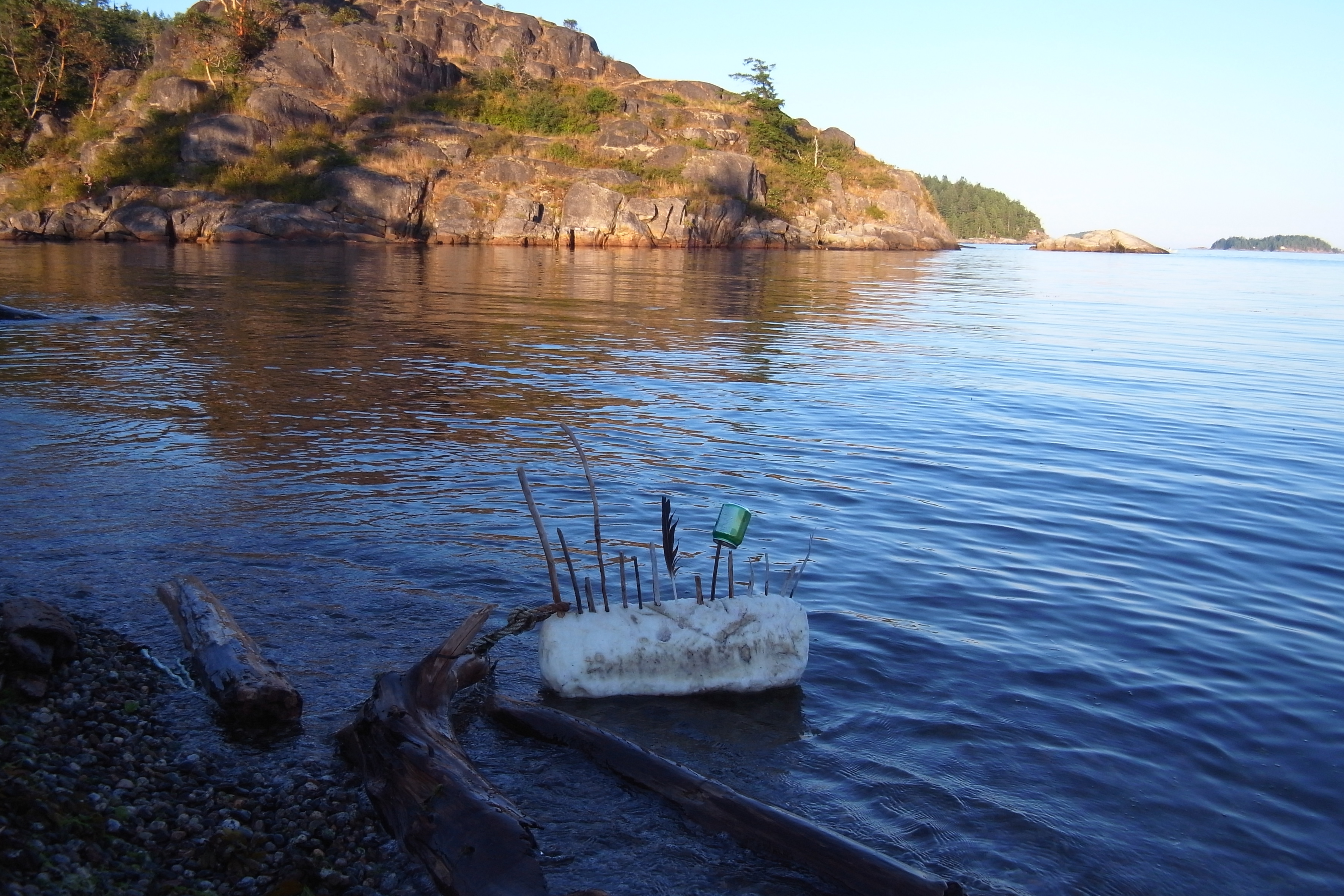 On my last visit, there was a big piece of Styrofoam floating right at the shoreline. But it had been made into a boat with little stick masts, decorated with feathers and tethered to the shore with rope. I used its ambiguous status, floating somewhere between toy and garbage and art, as an excuse for not carrying it to the trash. Two weeks later there’s no sign of the ‘boat,’ and I feel slightly guilty for leaving it as I pull piles of crumbling Styrofoam from the high tide line. But my regrets are soon interrupted by a little crab and bottle cap, left side by side on a log – someone’s beachcombing treasures. I began to wonder if finding and playing with plastic waste has become as normal a part of going to the beach as looking for baby crabs under rocks, not even registering as unsightly litter (never mind potentially toxic or harmful to marine life).