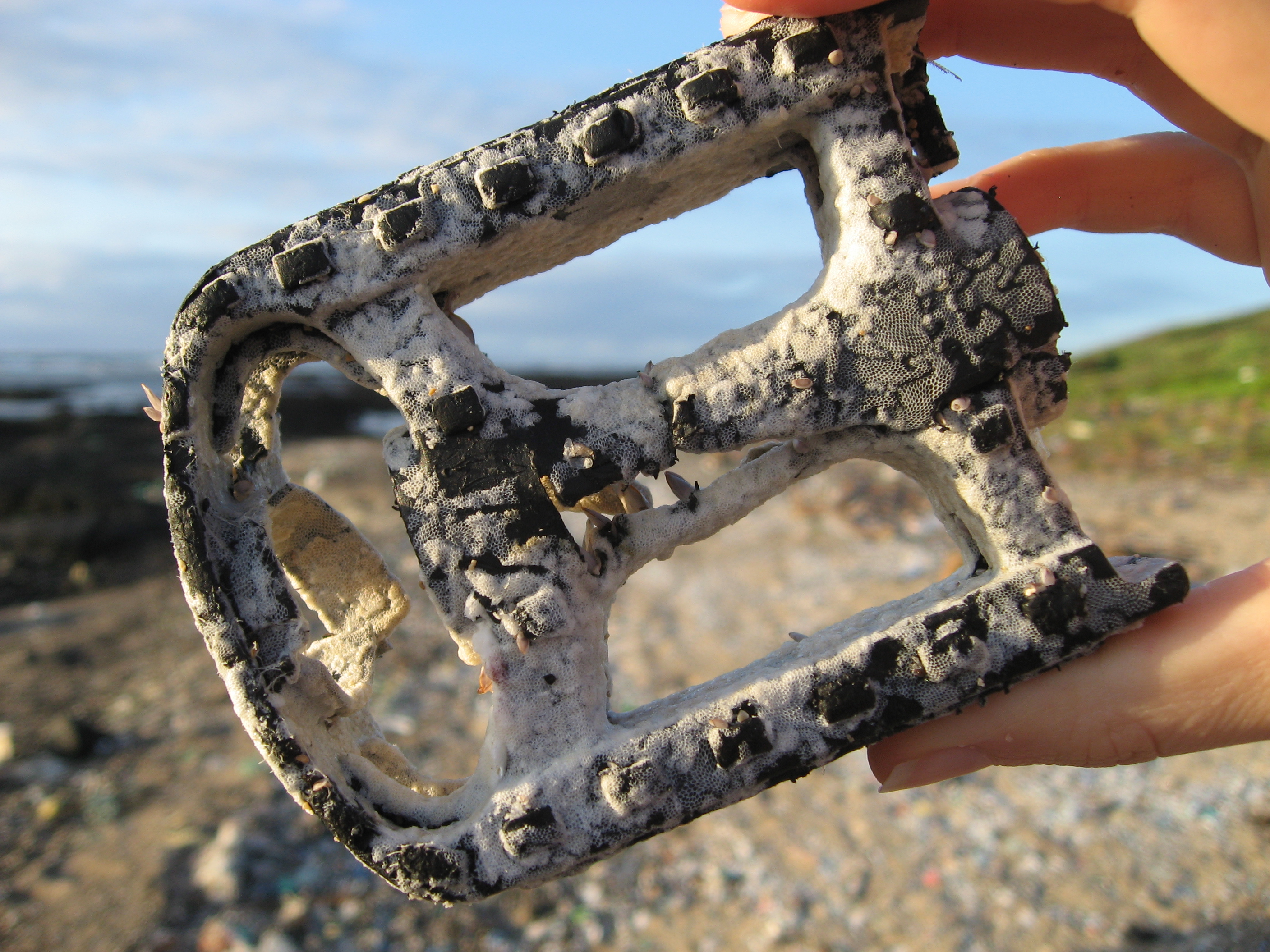 The beach is an unforgettable lesson in what things are made of plastic, and what kinds of plastics float. I learn by looking that rolls of tape, bicycle pedals and umbrella handles qualify in both categories. And so too, I learn, does Astroturf. With disturbingly poetic irony, I pick fake grass off a plastic beach. We also saw lots of bottle caps, bottles with caps (the most common kinds of plastic bottles sink when not full of air), and a surprising number of toothbrushes, most extremely weathered, bristles worn down to almost nothing. From amongst these broken pieces, Noni and I pulled a collection of strange treasures, including wheels and lighters Noni is collecting for art projects. I am particularly intrigued by seemingly less-interesting knotted pieces of plastic bag. I learned a few months back that Hawaii promoted a ‘knot your bag’ campaign in an effort to ground flighty plastic film, and wonder whether it did more than make people feel better about using disposable plastic.