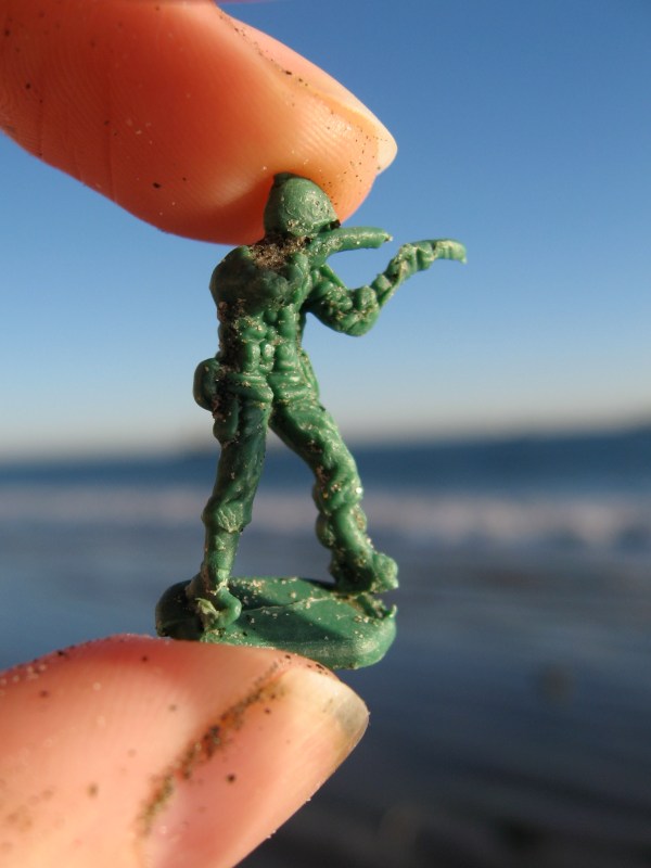 As the sun begins to set over the oil rigs and port cranes, I pluck a green plastic army man from the sand, adding the military to the web of primary resource extraction, shipping and consumption on display in front of me. With synthetic materials heavily developed during WWII, chemical companies looking for postwar markets helped establish plastic’s current ubiquity (not to mention the place of oil in ongoing conflicts). While he takes aim at the sea, the tiny figure gives no clue as to where he was molded, and I wonder how many times the plastic materials have crossed the Pacific.