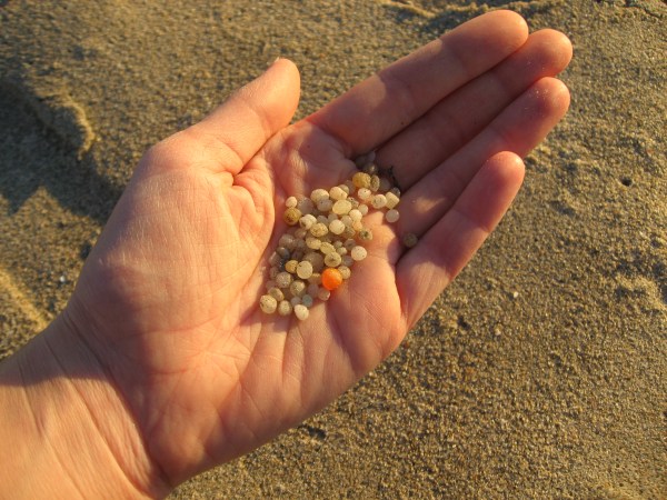 Yesterday I walked the Long Beach shore in the late afternoon sun. As usual, I was on the lookout for plastic, but I also had a more specific mission: I was hunting for nurdles. But what, you ask, is a nurdle? Nurdle is the nickname given to pre-production plastic pellets. Not to be confused with crumbled bits of Styrofoam, these little beads-without-holes are what plastic looks like before it’s molded into more familiar objects. They are far more difficult to pick up than to find, once you know what they are and where to look in the sand (you can see at least eight in the blog banner image too). Freshly produced nurdles are smooth and bright, but over time the pellets get worn by sun and waves, and tinted by the synthetic toxins that stick to their oily surface (think all those nice things like BPA, PCBs and DDT that we’ve been flushing out to sea for decades). The more yellowed or browned, the longer they’ve been at sea and the more chemicals they’ve amassed.