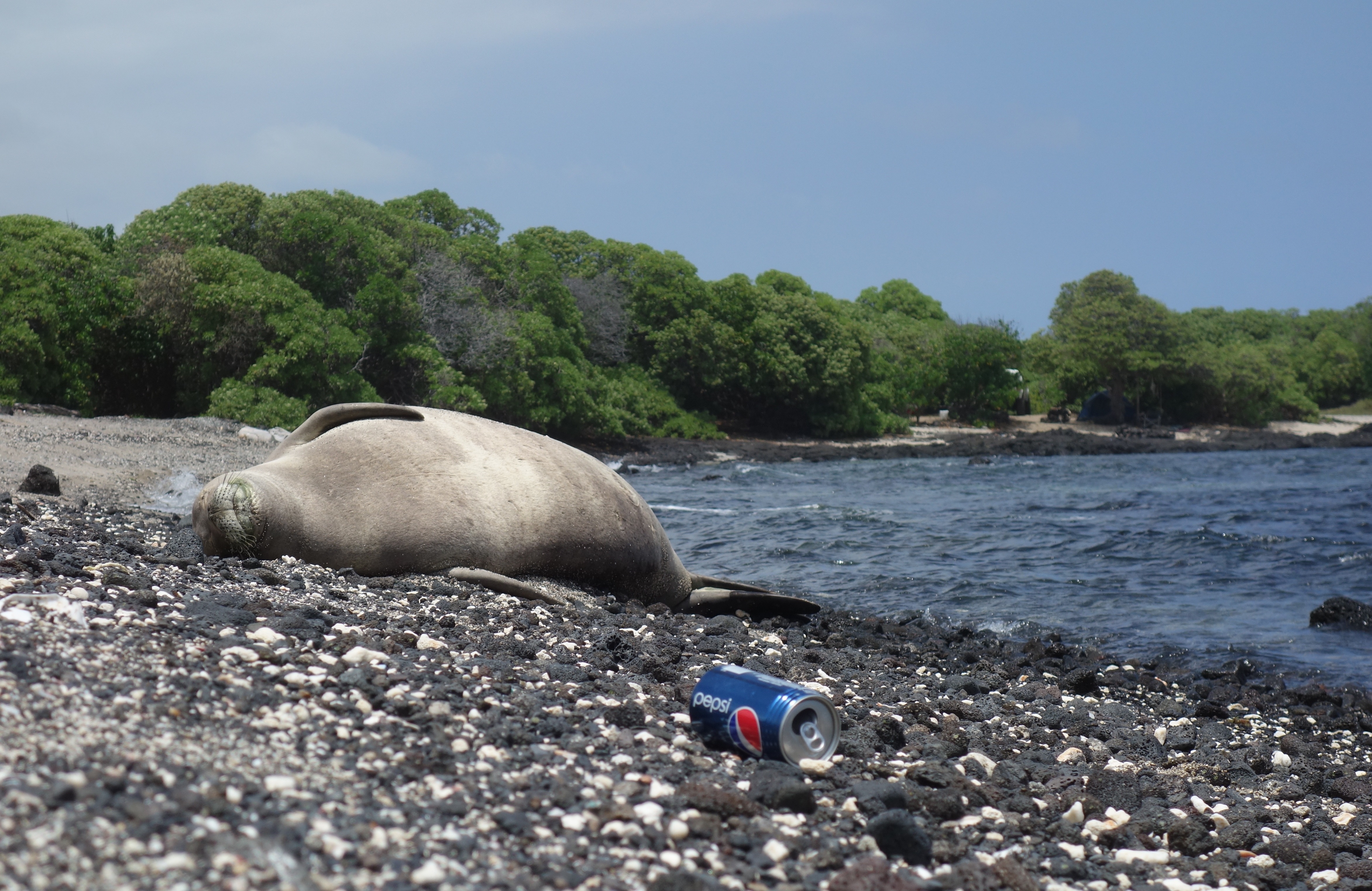 Had this been my first trip to Kamilo I might have been disappointed by the relative lack of spectacular piles of trash. Not finding what you’re looking for has a tendency to be kind of disappointing, even when the thing you’re looking for is plastic garbage. Just ask anyone that’s gone looking for the ‘trash island.’ But as a return visitor, I find the changes somewhat encouraging if only symbolically. Plastic problems are far from resolved, but should we manage to stop producing so much plastic, there’s hope for reducing the rate of accumulation that we’re busy trying to measure, for cleaning up at least the visible stuff if not all the associated toxins. We are not the only creatures to notice the difference. A very large Hawaiian Monk seal also visits the beach, coming up to rest on the sand. It’s a rare sight as monk seals are endangered because of entanglement with plastic, and only 1200 seals remain.