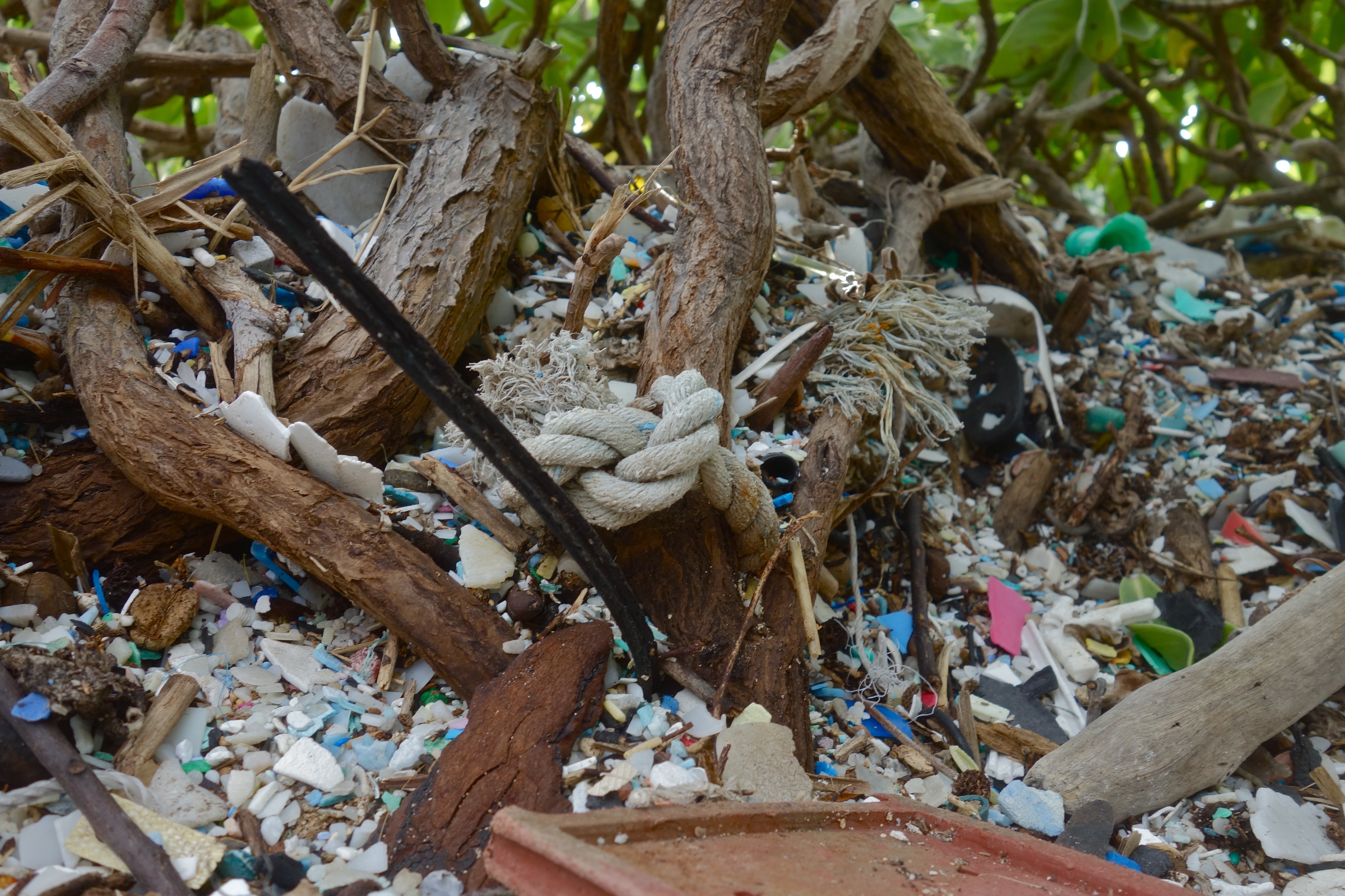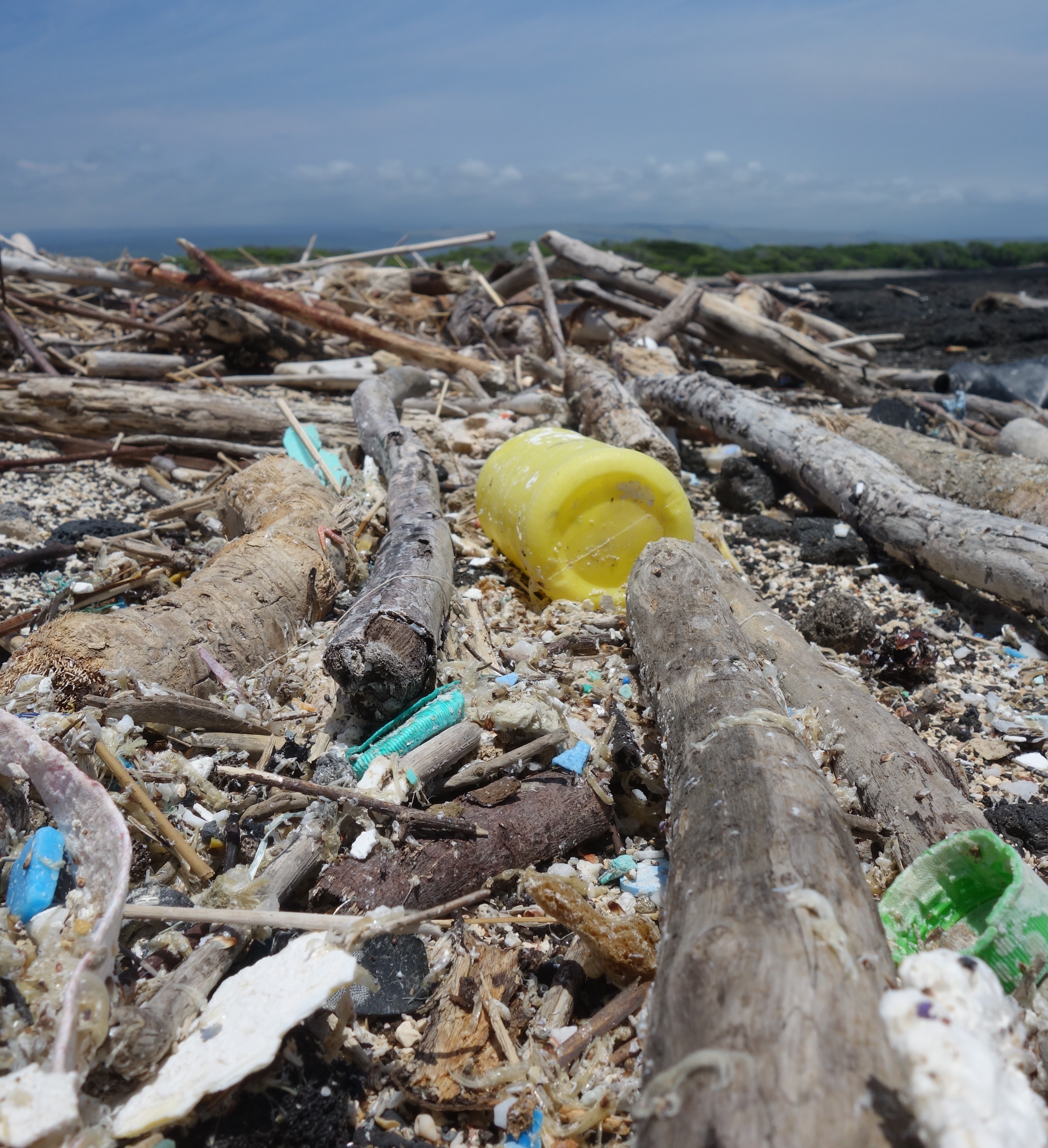 So if there’s supposed to be more debris arriving then why does the beach look cleaner? For starters, the Hawaii Wildlife Fund has been at Kamilo in full force, ramping up the number of cleanups both large and small over the past year. Thanks to their hard work, a lot of the most visible pieces have been picked up. But what about the microplastics, the bits that seemed to outnumber grains of sand, that were piled up several feet deep in places among the rocks? Most of them are still here, but they have shifted position. A storm in January drove all kinds of pieces, especially the small stuff, up into the bright green naupaka plants that line the shore, just out of reach of more usual tides. Though this keeps bits from being washed back out to sea, it also ensures that they are even more impossible to pick up, all mixed up with wood and soil and roots.