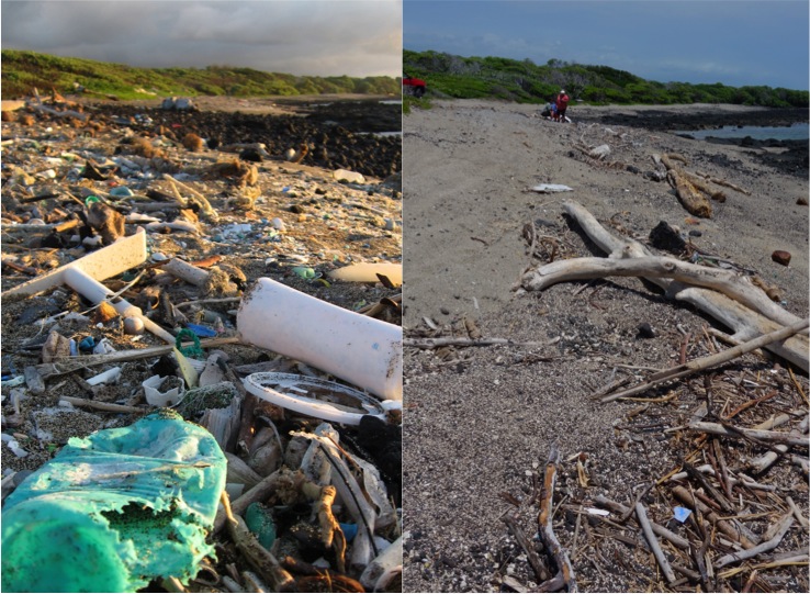 Almost a year to the day since my first visit, I find myself headed back to Kamilo, the famously plastic-covered ‘junk’ beach on the Big Island, Hawaii. It’s just after 6am, and I am bleary-eyed and over caffeinated, having just arrived on a date-line crossing flight from Tokyo the day before. I’ve signed up as a volunteer helping with a research project looking at the rate plastic is accumulating on the shore and have been promised a long day of hard labor shoveling sand. For the moment though, I’m using all my strength to keep my head and the truck roof from colliding as we bounce along the incredibly rough ‘road’ crossing the jagged expanse of a’a lava along the shore.